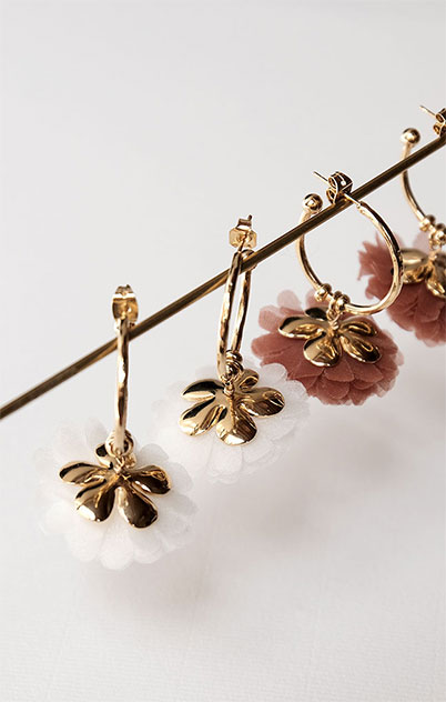 2 modèles de boucles d’oreilles mélangeant soie brodée et laiton recouvert d’or, sont proposés en 2 coloris.