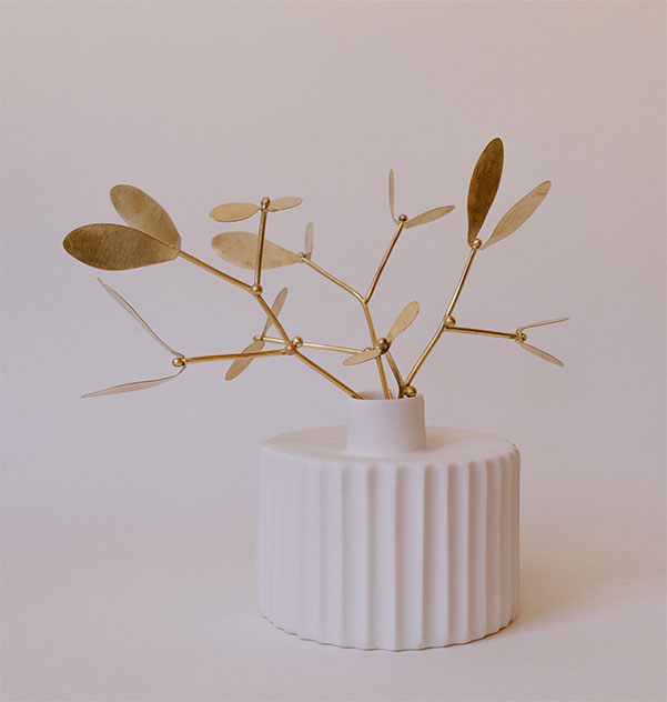 Graphiques et poétiques, ces branches de gui en laiton jouent avec la légèreté de leurs feuilles allongées. Deux formats s’harmonisent à une gamme de vases en biscuit de porcelaine.