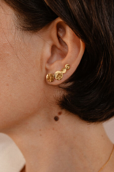 105,00 €Telle une succession de pépites d’or, ces boucles grimpantes suivent délicatement la courbe de l’oreille. Chaque fragment martelé capte les reflets de lumière et crée de discrets éclats. Existent en argenté.