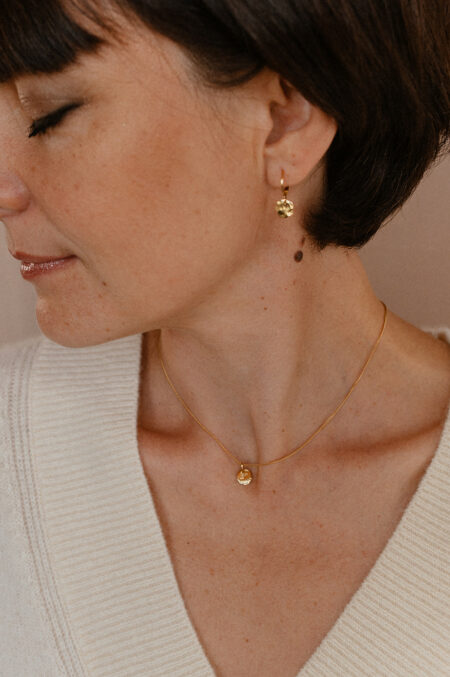 - Dorure : bijou en laiton plongé dans un bain d’or 24 carats. Ces métaux précieux ont été extraits avec des méthodes respectueuses de l’homme et de l’environnement (label RJC).