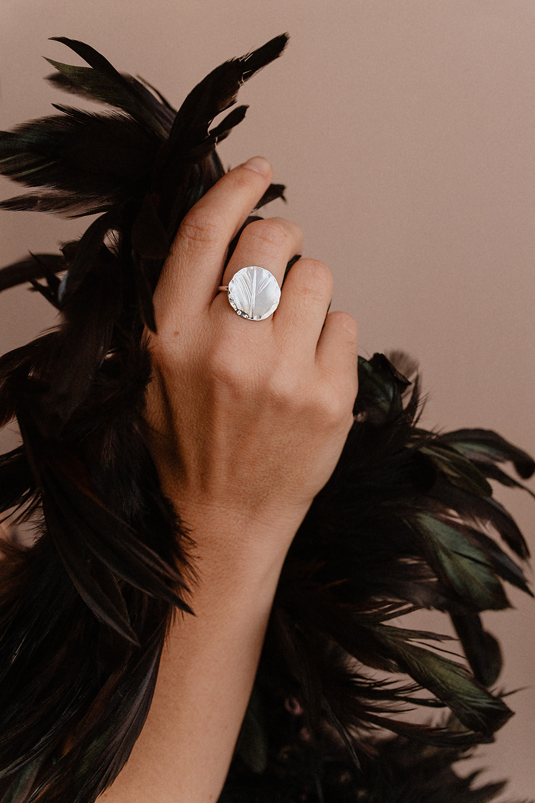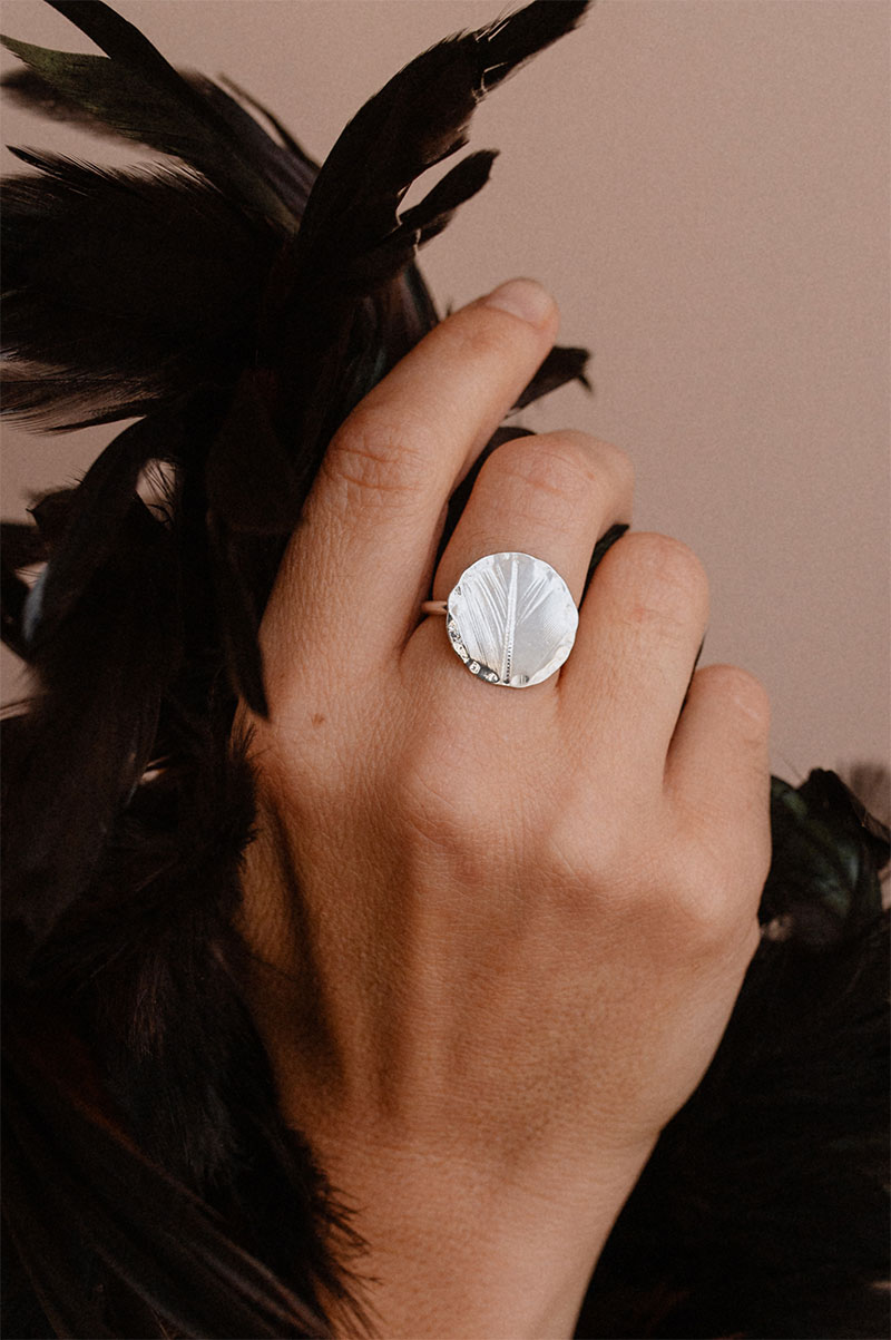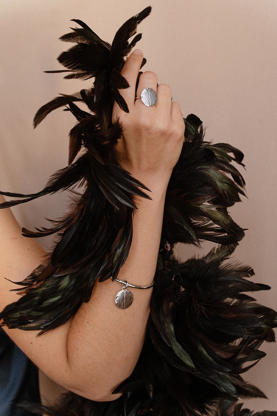 Tels de petits talismans, les bijoux de cette collection oscillent entre travail sculptural de la matière et légèreté de l’empreinte de plume.
