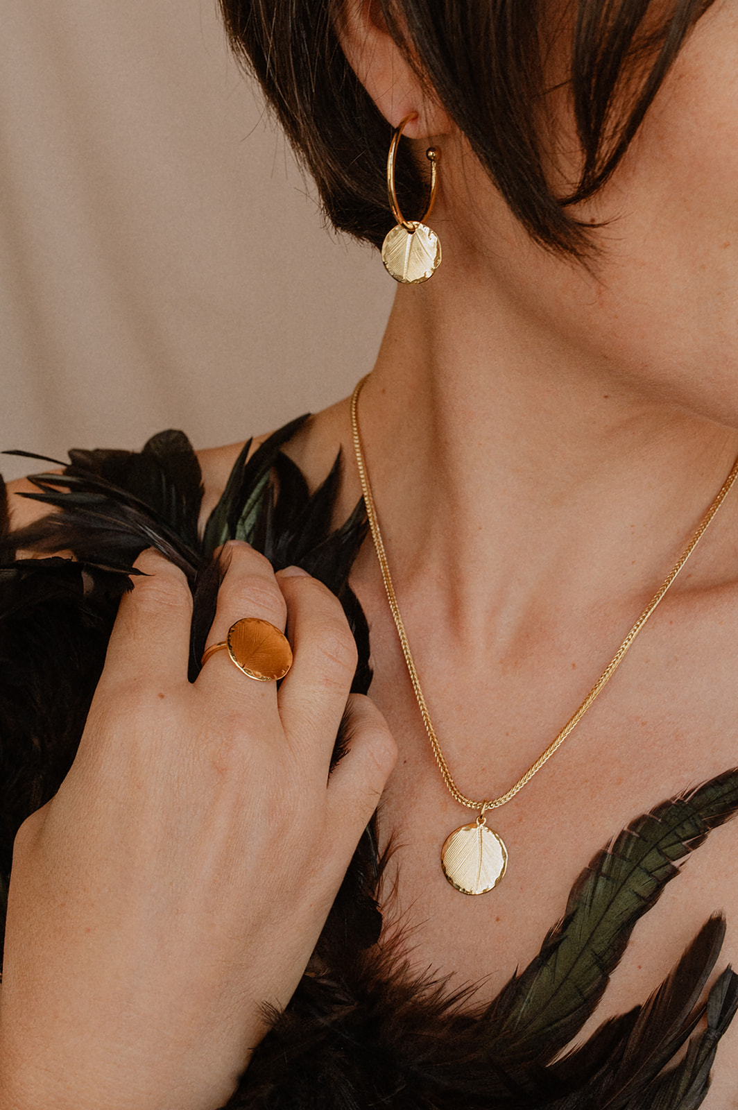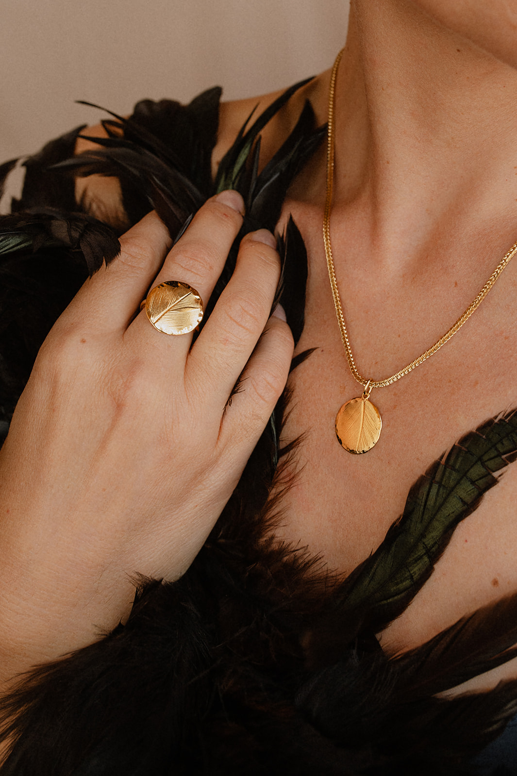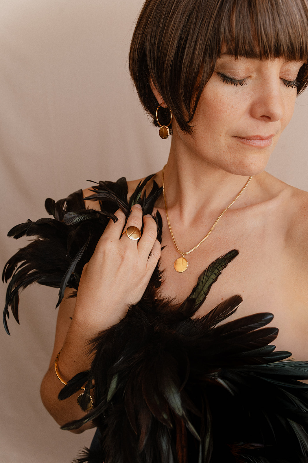 Tels de petits talismans, les bijoux de cette collection oscillent entre travail sculptural de la matière et légèreté de l’empreinte de plume.