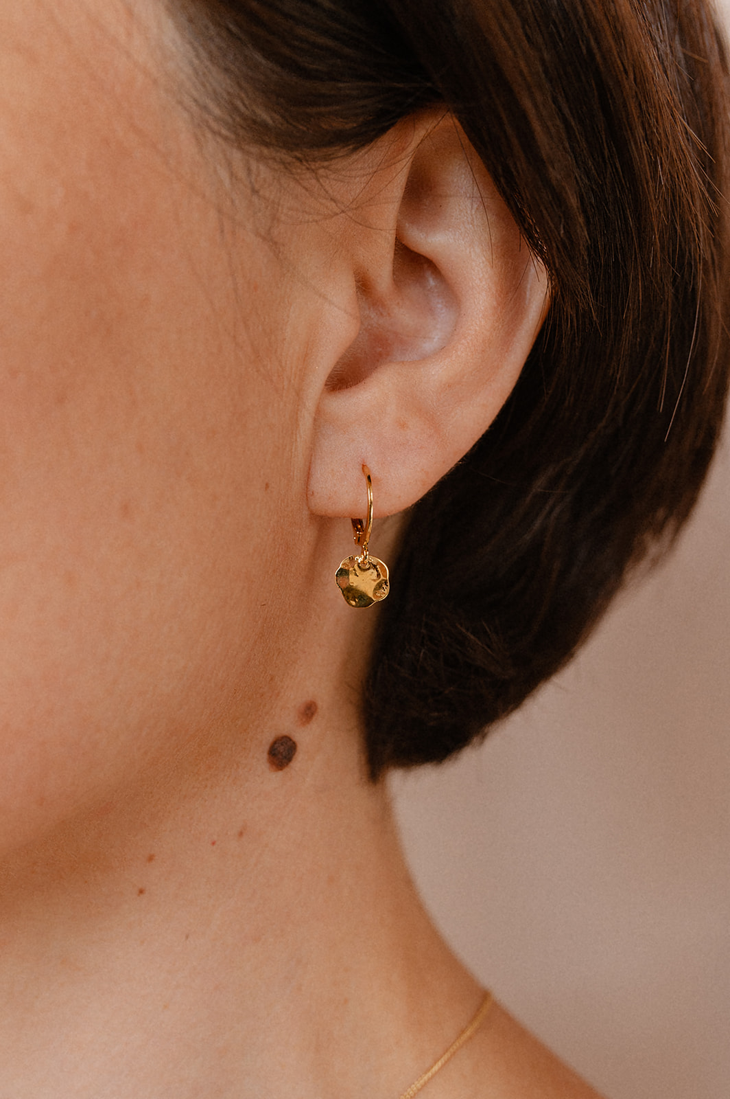De fins pétales martelés comme une touche de lumière, sont délicatement suspendus à des dormeuses.