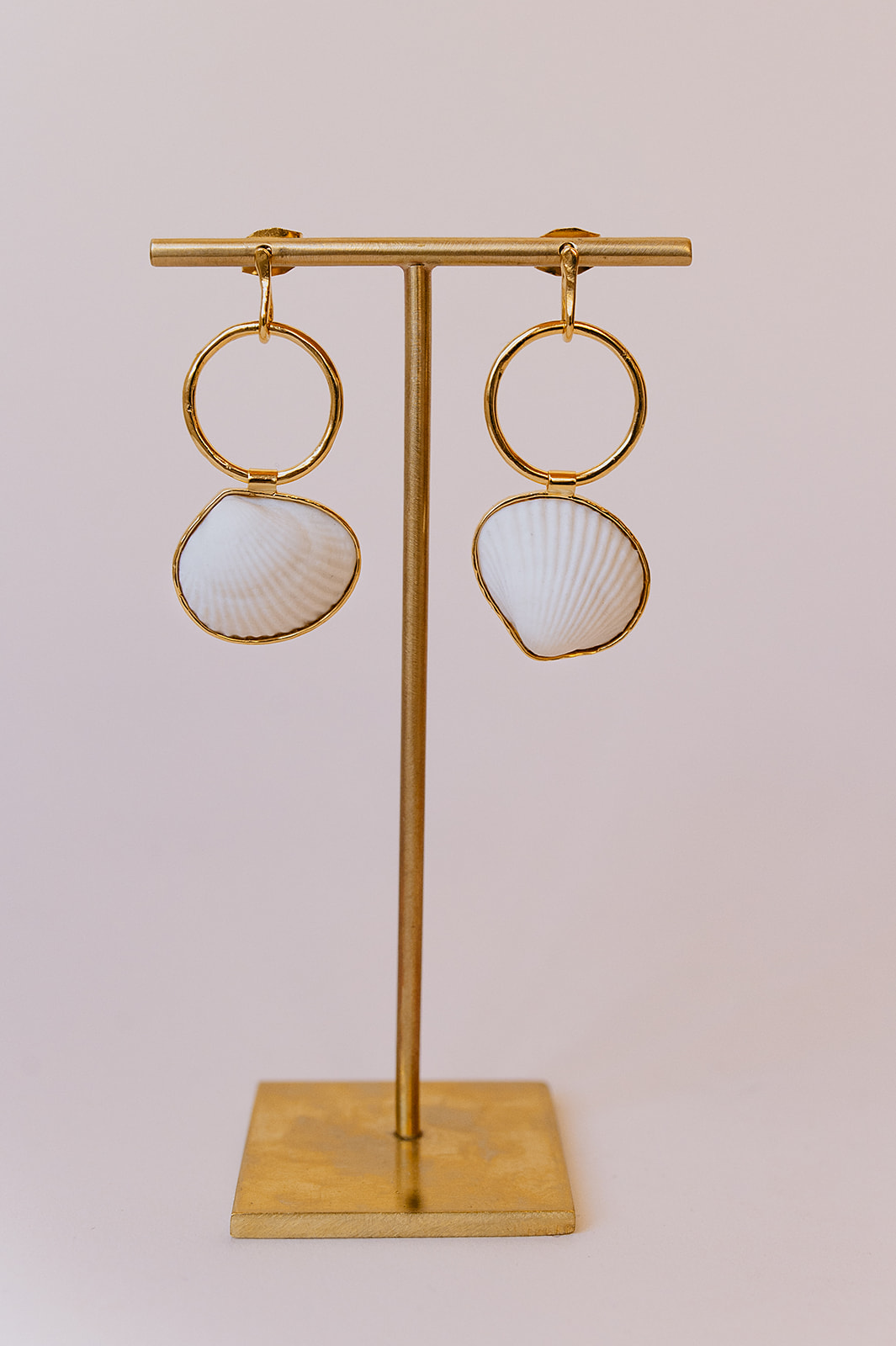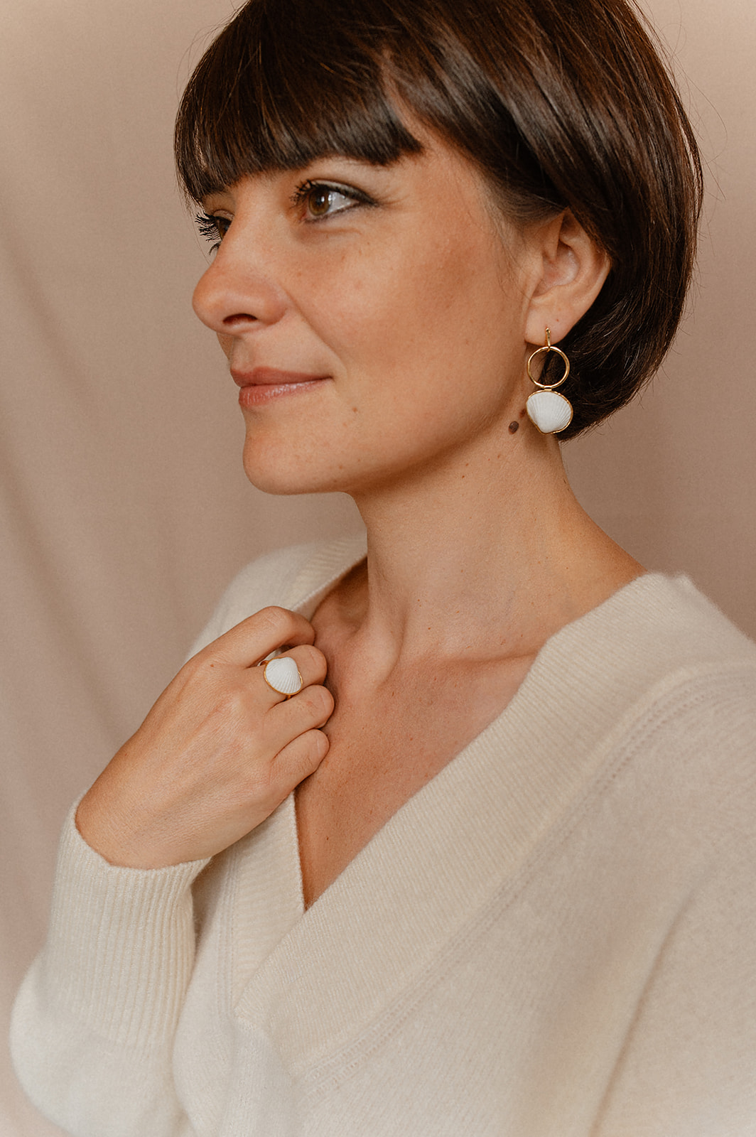Boucles d’oreilles ornées d’un coquillage en biscuit de porcelaine, fabriqué à la main.