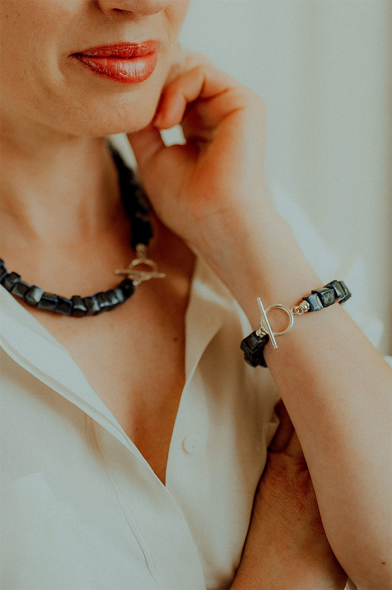 Dans l’Égypte antique, l’amulette fait référence à la protection, la sécurité le bien-être. Une symbolique puissante pour ce bracelet composé de perles en porcelaine fabriquées main, montées sur chaîne. Couleur bleu avec nuance de vert. Existe en doré.