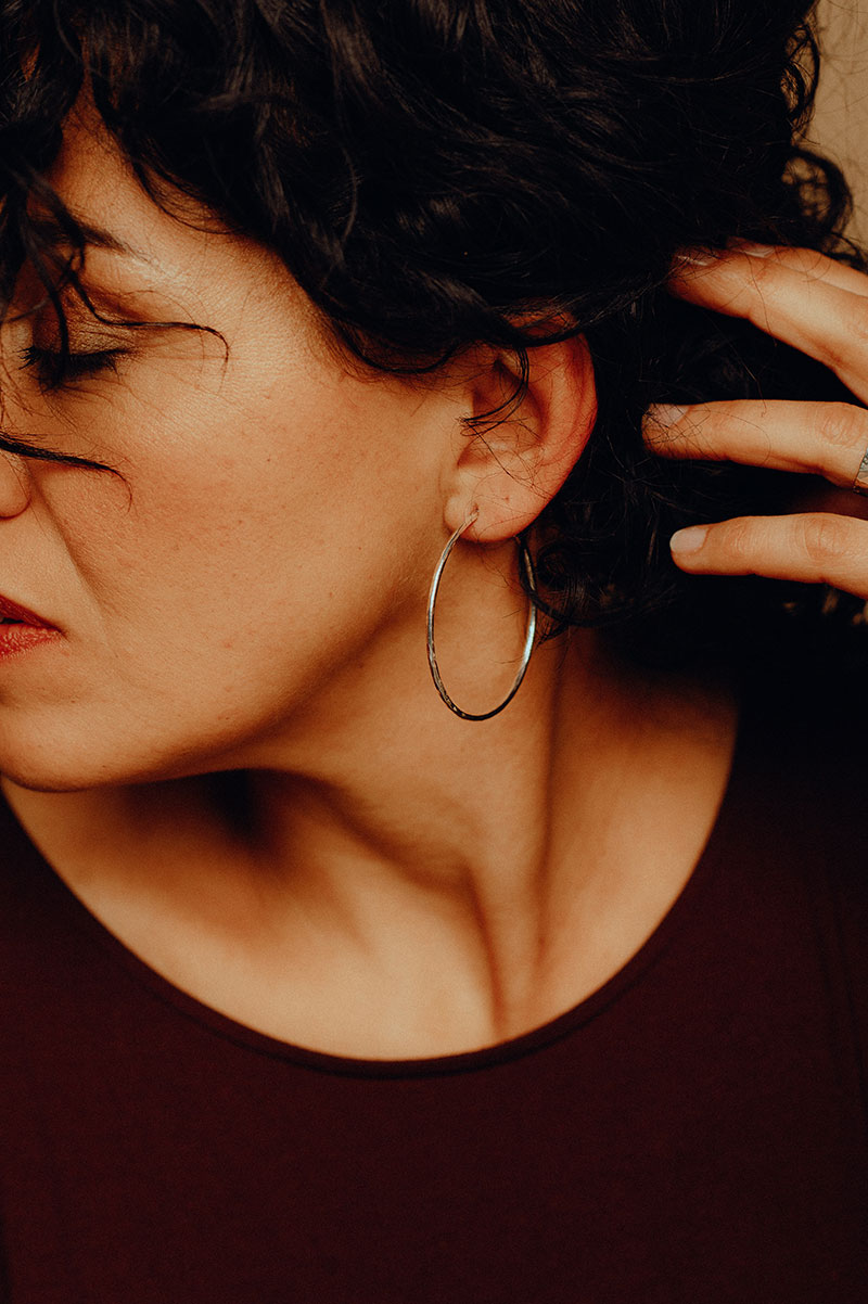 Le travail du martelage s’associe à des découpes presque brutes: croix, accumulation de fleurs, pour donner naissance à des bijoux au charme accidenté.