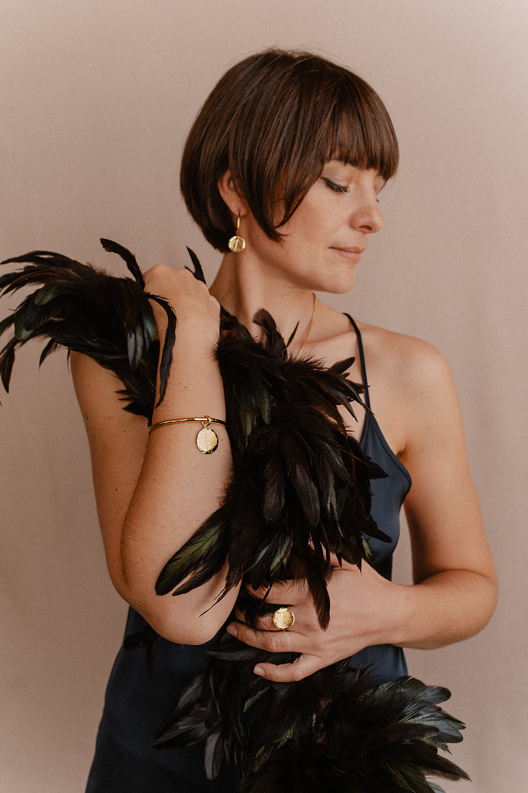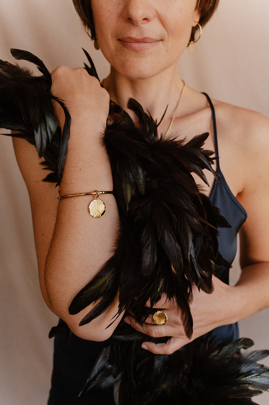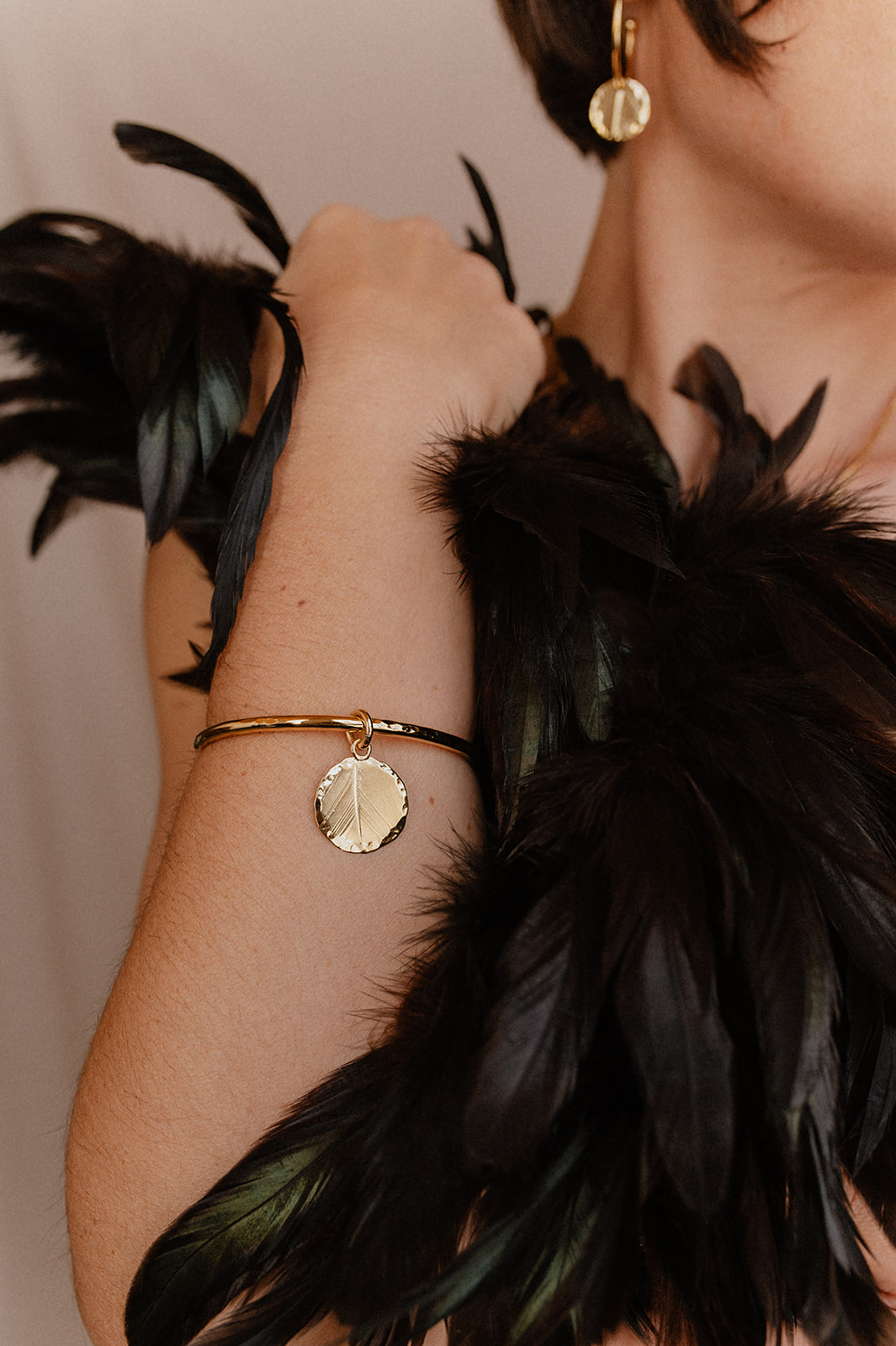 Médaille délicatement travaillée dont le pourtour martelé vient illuminer une empreinte de plume. Montée sur un jonc légèrement martelé. Existe en argenté . Peut se porter en accumulation avec les joncs de la collection Frida.