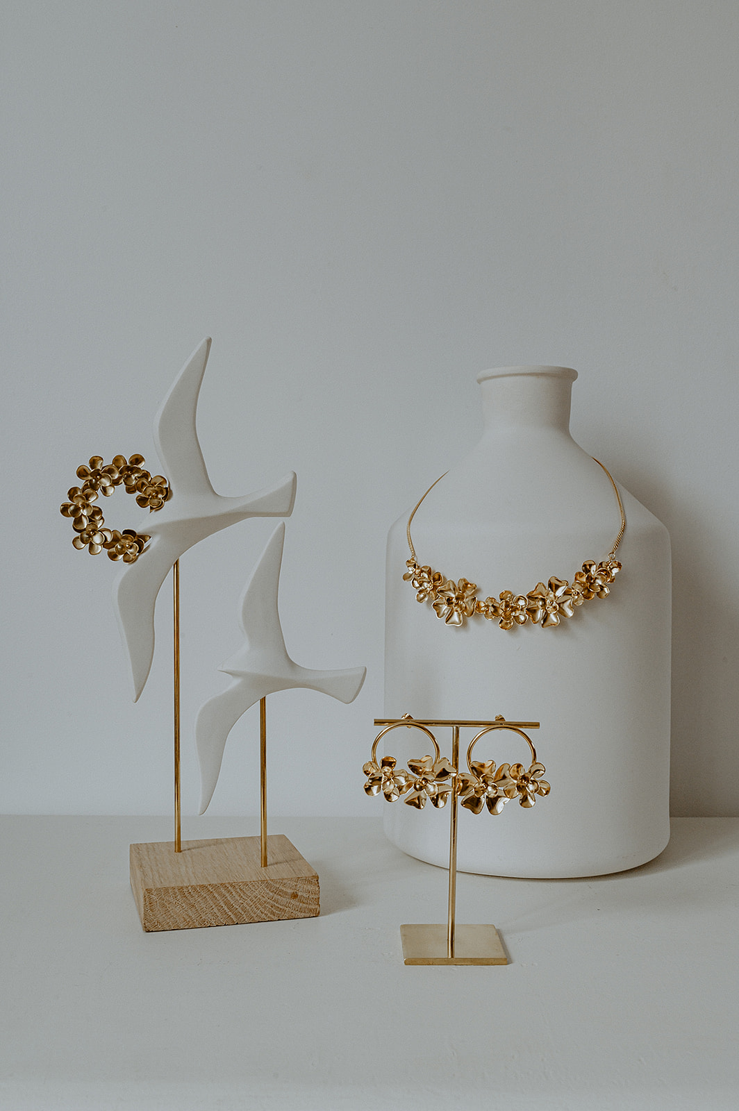 Les ornements de laiton qui  habillent les sculptures en biscuit de porcelaine sont repris puis déclinés en bijoux (voir les bijoux Les Beaux Jours).